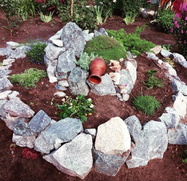 Красивые клумбы из камней располагают в любой части участка, в зоне отдыха, перед домом, у входа, вдоль забора. Рекомендуется избегать очень влажных и сильно продуваемых мест.