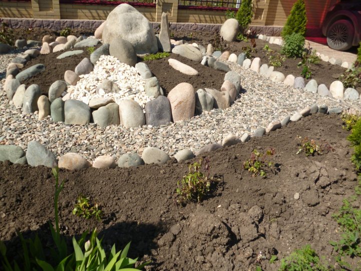 Самый простой цветник из камней несложно сделать своими руками без особых навыков данной работы.